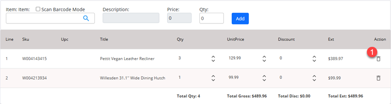 Click the Delete action button next to the item you wish to delete from order. |