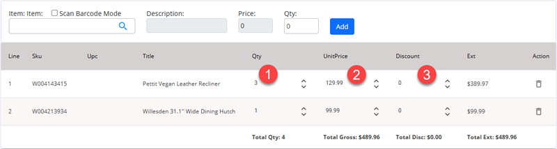 Click Add button to add item to order. New item will display in list below add item line. |