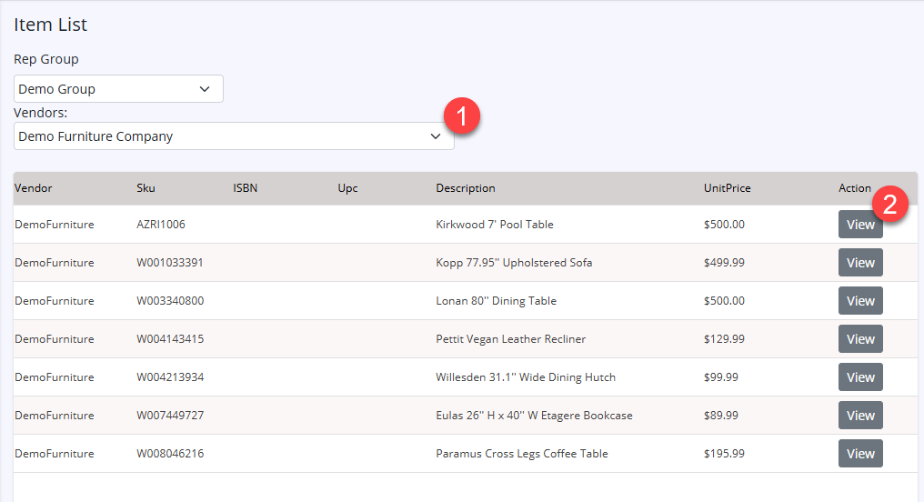 Click View button next to existing item, to view the item. |