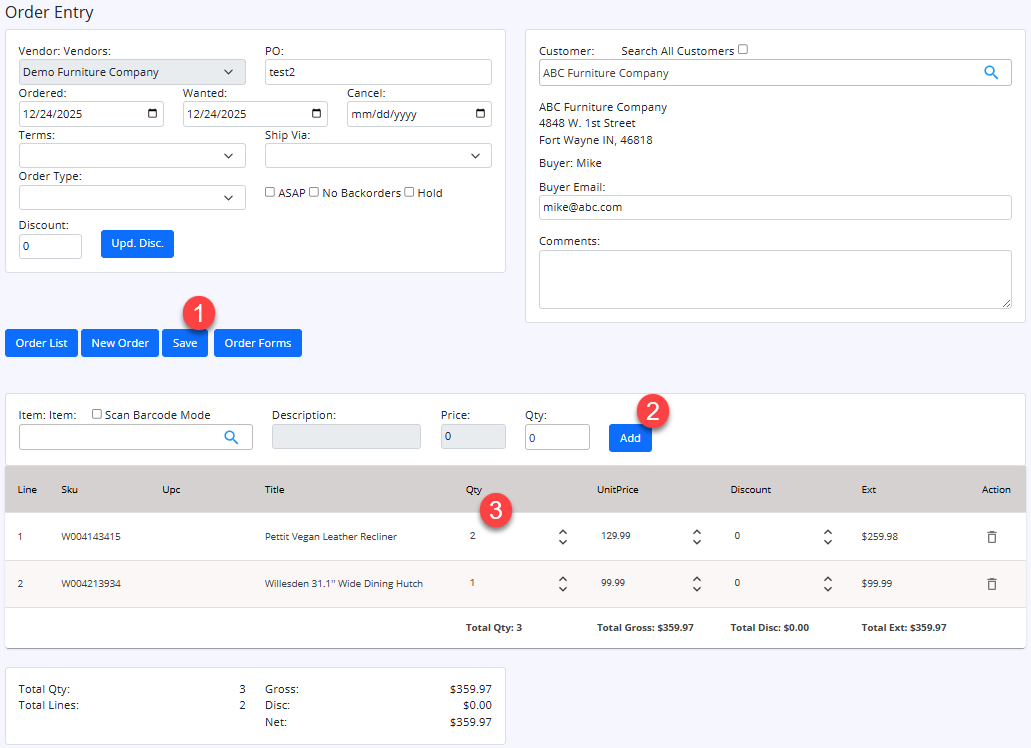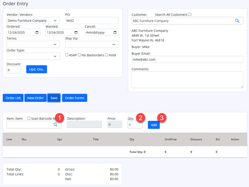 After saving order the first time, the enter items section will display to allow entering items for the order.