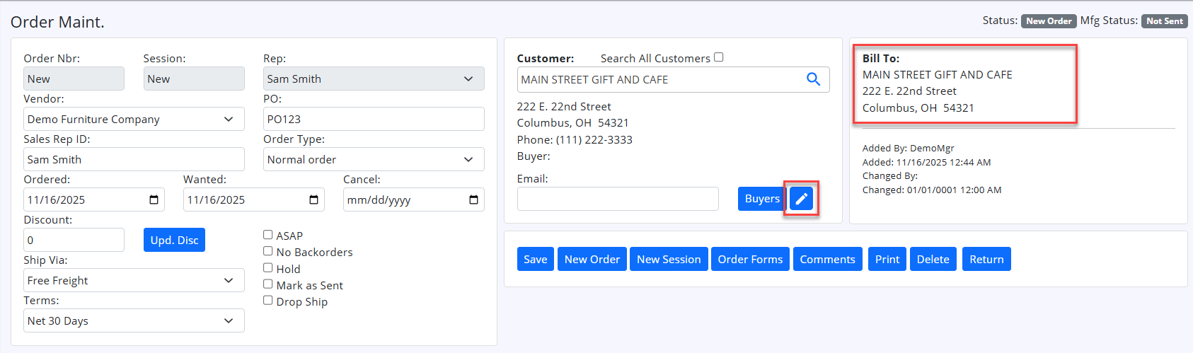Order Entry Page Changes