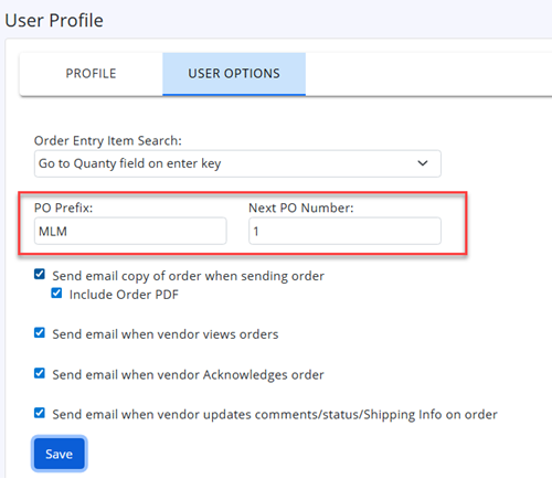Enter the Prefix value you want, and optionally enter Next PO number. Click Save button.
