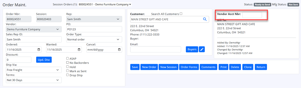 -Vendor Customer Account Nbr is now shown. You can edit this value, and it will be saved for future orders too.