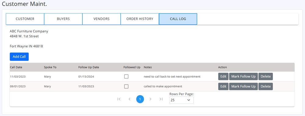 You may enter new calls for any store from here, without going to the Customer Maint. Call log page