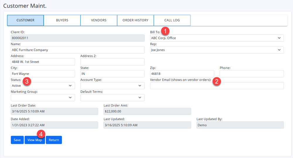 | 3) Status | Use this drop down to mark customer as active or in-active. |