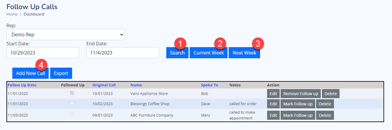 | 3) Next Week Button | Display all follow up calls for next week. |