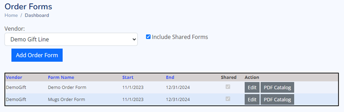 Select Vendor from drop down, to view orders forms for this vendor.