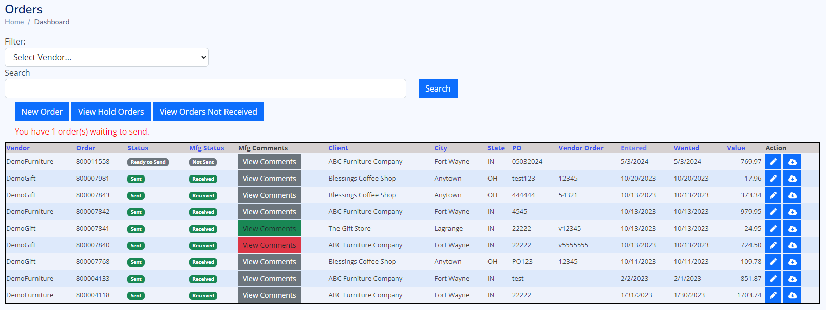 | Hold | Order is placed on Hold. And will not be sent to vendor |