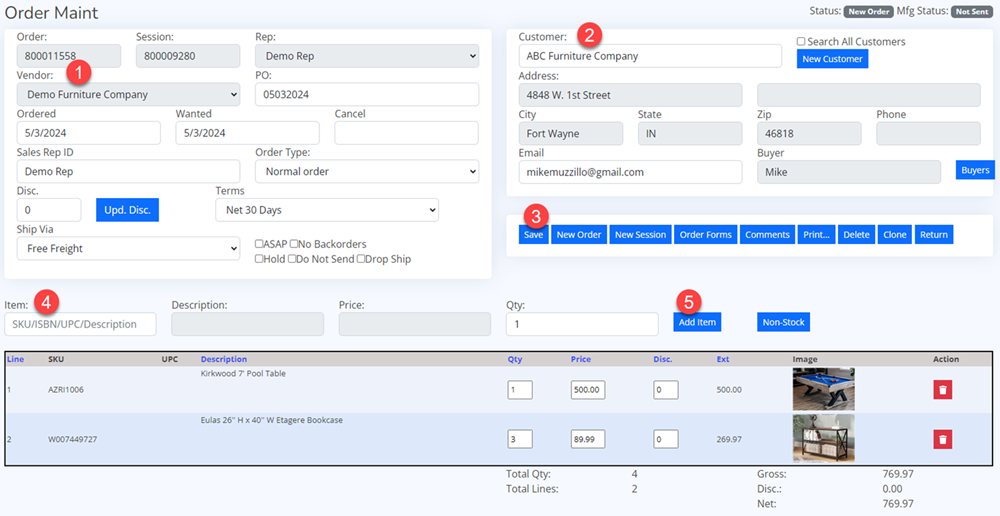 | 4) Find Items | Start typing sku or description, and select item from dropdown of items then tab to qty field and enter order qty. Qty will default to Min Order Qty |